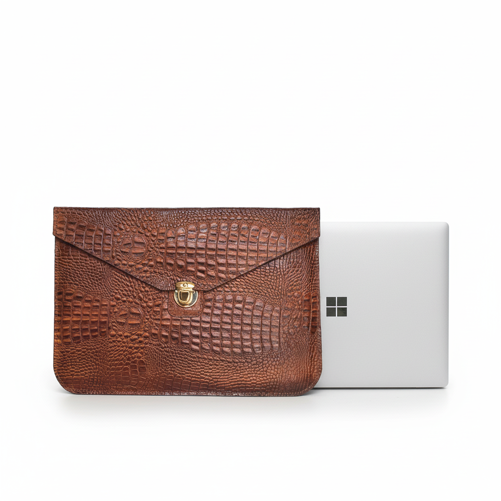 بدنه این کاور از چرم طبیعی گاوی مرغوب با طرح بچه کروکودیل به رنگ عسلی ساخته شده که علاوه بر زیبایی چشم‌نواز، دوام و مقاومت بالایی در برابر سایش، خط‌وخش و ضربه دارد. قفل فلزی مستحکم به‌ کار رفته در طراحی کاور، امنیت لپ‌تاپ شما را تضمین کرده و حس کیفیت و استحکام را به‌ خوبی منتقل می‌کند.