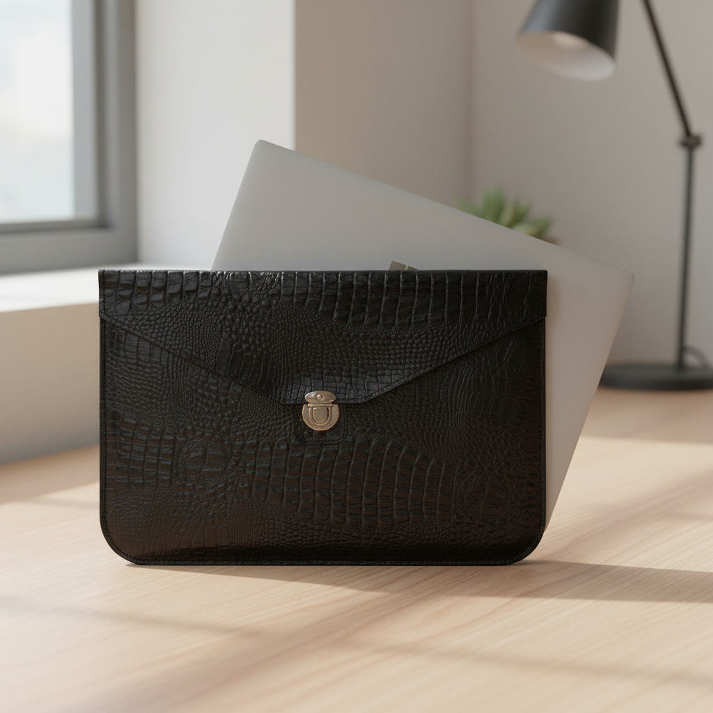 بدنه این کاور از چرم طبیعی گاوی مرغوب با طرح بچه کروکودیل به رنگ مشکی ساخته شده که علاوه بر زیبایی چشم‌نواز، دوام و مقاومت بالایی در برابر سایش، خط‌وخش و ضربه دارد. قفل فلزی مستحکم به‌ کار رفته در طراحی کاور، امنیت لپ‌تاپ شما را تضمین کرده و حس کیفیت و استحکام را به‌ خوبی منتقل می‌کند.