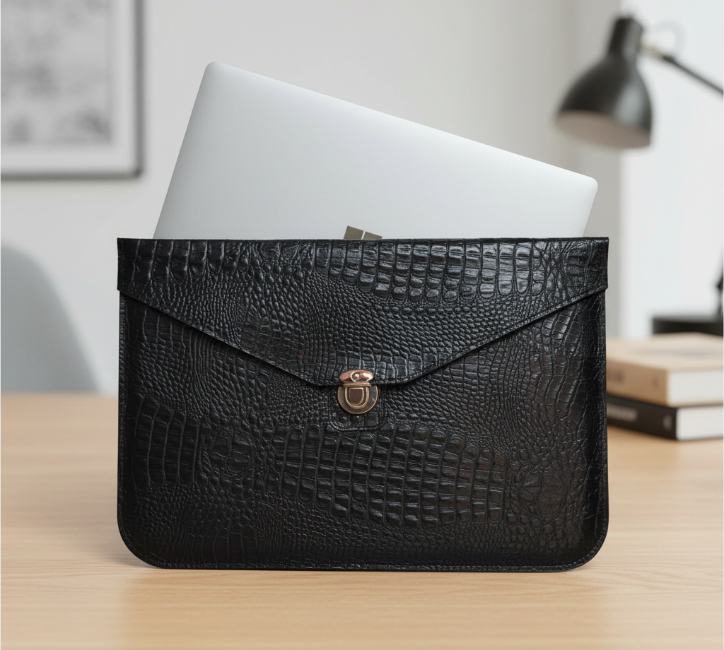 بدنه این کاور از چرم طبیعی گاوی مرغوب با طرح بچه کروکودیل به رنگ مشکی ساخته شده که علاوه بر زیبایی چشم‌نواز، دوام و مقاومت بالایی در برابر سایش، خط‌وخش و ضربه دارد. قفل فلزی مستحکم به‌ کار رفته در طراحی کاور، امنیت لپ‌تاپ شما را تضمین کرده و حس کیفیت و استحکام را به‌ خوبی منتقل می‌کند.