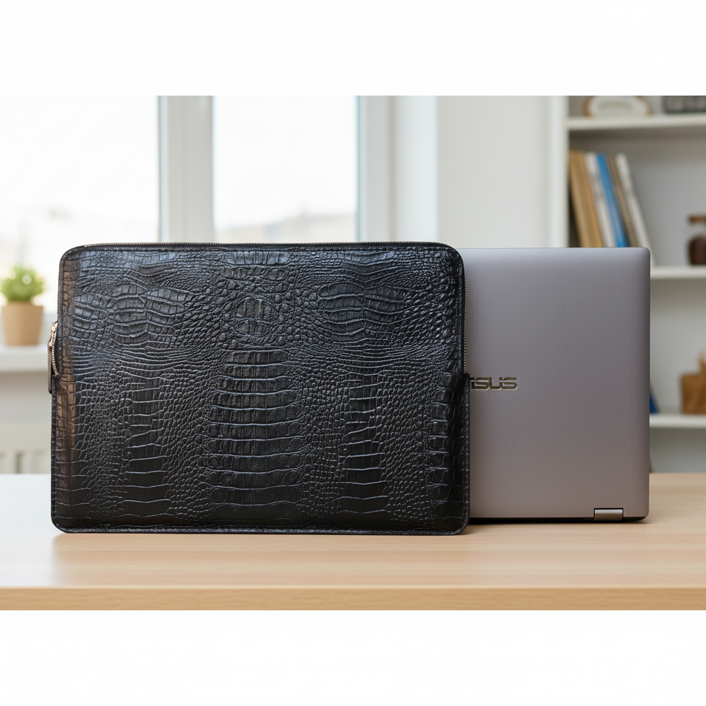 بدنه این کاور از چرم طبیعی گاوی مرغوب با طرح بچه کروکودیل به رنگ مشکی ساخته شده که علاوه بر زیبایی چشم‌نواز، دوام و مقاومت بالایی در برابر سایش، خط‌وخش و ضربه دارد. زیپ فلزی مستحکم به‌ کار رفته در طراحی کاور، امنیت لپ‌تاپ شما را تضمین کرده و حس کیفیت و استحکام را به‌ خوبی منتقل می‌کند.