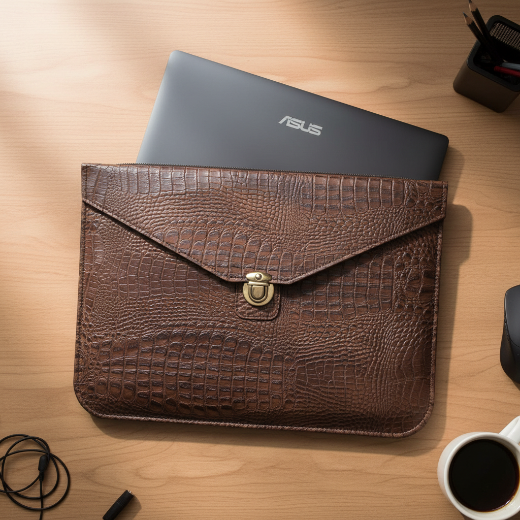 بدنه این کاور از چرم طبیعی گاوی مرغوب با طرح بچه کروکودیل به رنگ نسکافه ای ساخته شده که علاوه بر زیبایی چشم‌نواز، دوام و مقاومت بالایی در برابر سایش، خط‌وخش و ضربه دارد. قفل فلزی مستحکم به‌ کار رفته در طراحی کاور، امنیت لپ‌تاپ شما را تضمین کرده و حس کیفیت و استحکام را به‌ خوبی منتقل می‌کند.