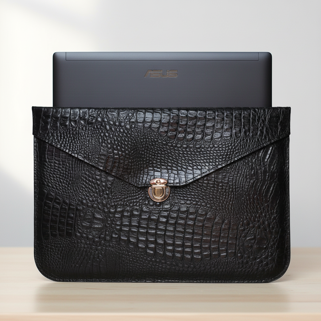 بدنه این کاور از چرم طبیعی گاوی مرغوب با طرح بچه کروکودیل به رنگ مشکی ساخته شده که علاوه بر زیبایی چشمنواز، دوام و مقاومت بالایی در برابر سایش، خطوخش و ضربه دارد. قفل فلزی مستحکم به کار رفته در طراحی کاور، امنیت لپتاپ شما را تضمین کرده و حس کیفیت و استحکام را به خوبی منتقل میکند.