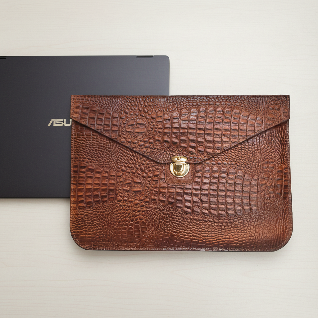بدنه این کاور از چرم طبیعی گاوی مرغوب با طرح بچه کروکودیل به رنگ عسلی ساخته شده که علاوه بر زیبایی چشم‌نواز، دوام و مقاومت بالایی در برابر سایش، خط‌وخش و ضربه دارد. قفل فلزی مستحکم به‌ کار رفته در طراحی کاور، امنیت لپ‌تاپ شما را تضمین کرده و حس کیفیت و استحکام را به‌ خوبی منتقل می‌کند.
