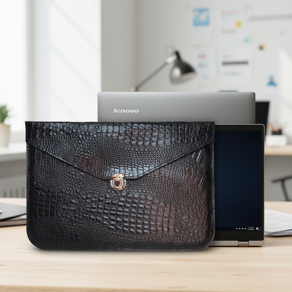 بدنه این کاور از چرم طبیعی گاوی مرغوب با طرح بچه کروکودیل به رنگ مشکی ساخته شده که علاوه بر زیبایی چشم‌نواز، دوام و مقاومت بالایی در برابر سایش، خط‌وخش و ضربه دارد. قفل فلزی مستحکم به‌ کار رفته در طراحی کاور، امنیت لپ‌تاپ شما را تضمین کرده و حس کیفیت و استحکام را به‌ خوبی منتقل می‌کند.