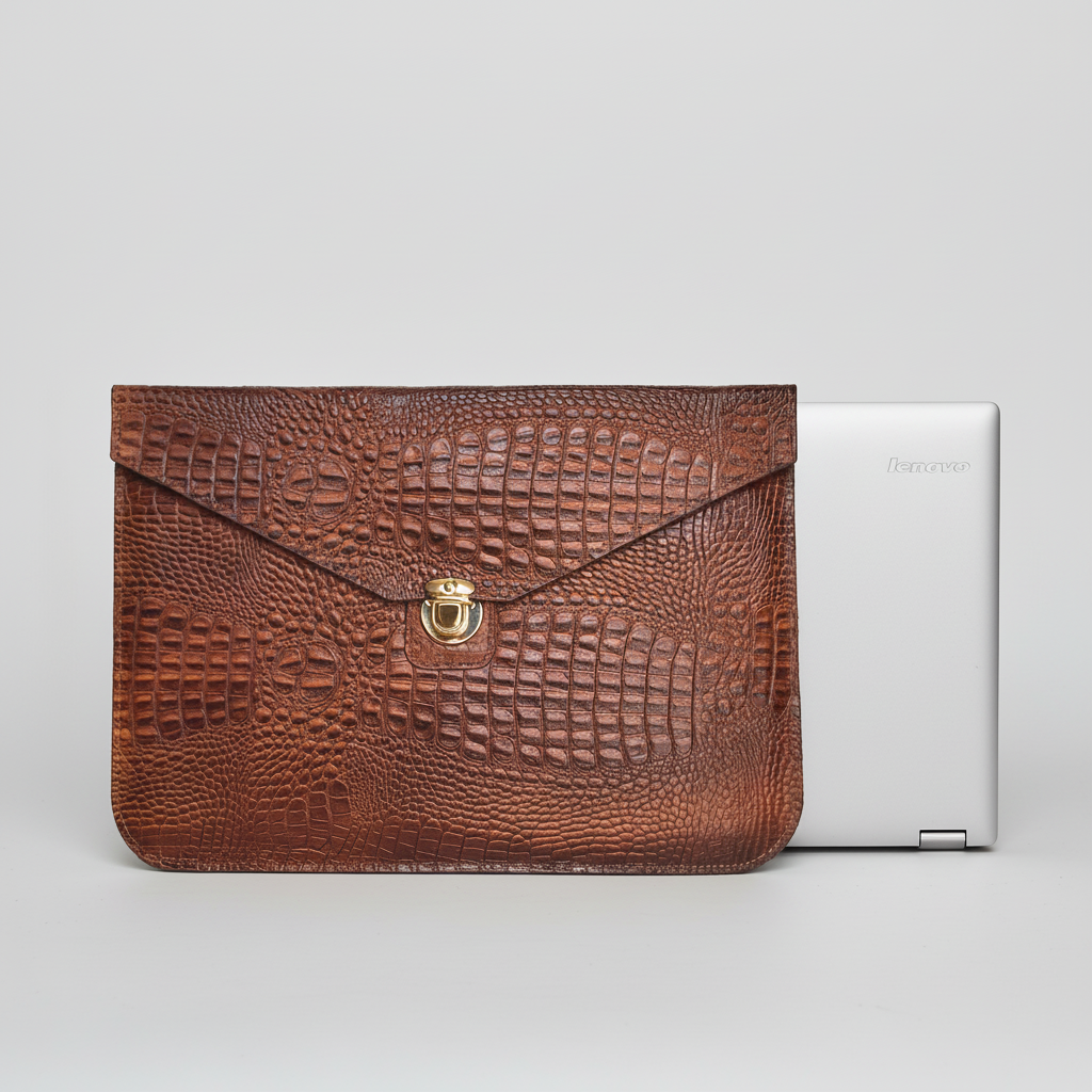 بدنه این کاور از چرم طبیعی گاوی مرغوب با طرح بچه کروکودیل به رنگ عسلی ساخته شده که علاوه بر زیبایی چشمنواز، دوام و مقاومت بالایی در برابر سایش، خطوخش و ضربه دارد. قفل فلزی مستحکم به کار رفته در طراحی کاور، امنیت لپتاپ شما را تضمین کرده و حس کیفیت و استحکام را به خوبی منتقل میکند.