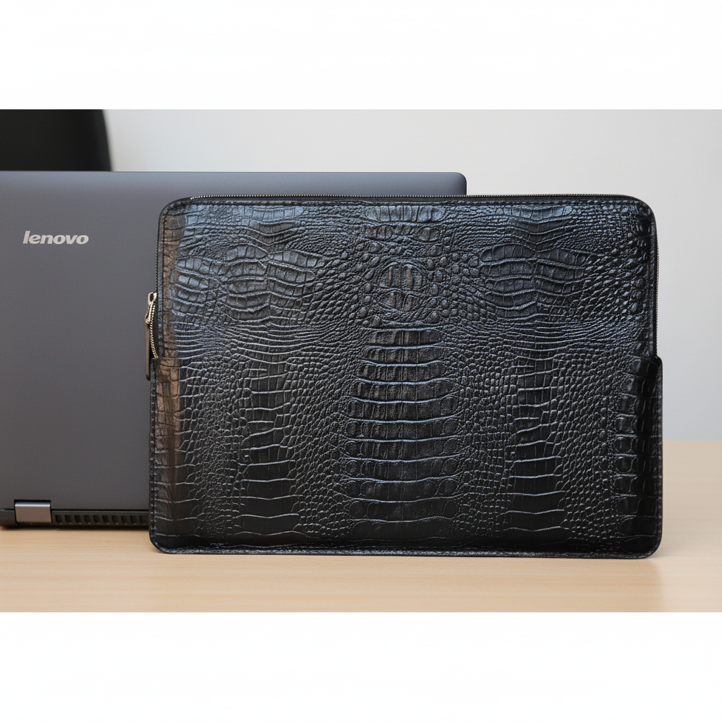 بدنه این کاور از چرم طبیعی گاوی مرغوب با طرح بچه کروکودیل به رنگ مشکی ساخته شده که علاوه بر زیبایی چشم‌نواز، دوام و مقاومت بالایی در برابر سایش، خط‌وخش و ضربه دارد. زیپ فلزی مستحکم به‌ کار رفته در طراحی کاور، امنیت لپ‌تاپ شما را تضمین کرده و حس کیفیت و استحکام را به‌ خوبی منتقل می‌کند.