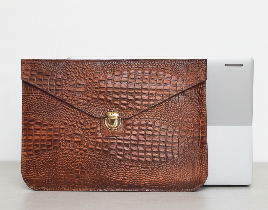 بدنه این کاور از چرم طبیعی گاوی مرغوب با طرح بچه کروکودیل به رنگ عسلی ساخته شده که علاوه بر زیبایی چشم‌نواز، دوام و مقاومت بالایی در برابر سایش، خط‌وخش و ضربه دارد. قفل فلزی مستحکم به‌ کار رفته در طراحی کاور، امنیت لپ‌تاپ شما را تضمین کرده و حس کیفیت و استحکام را به‌ خوبی منتقل می‌کند.