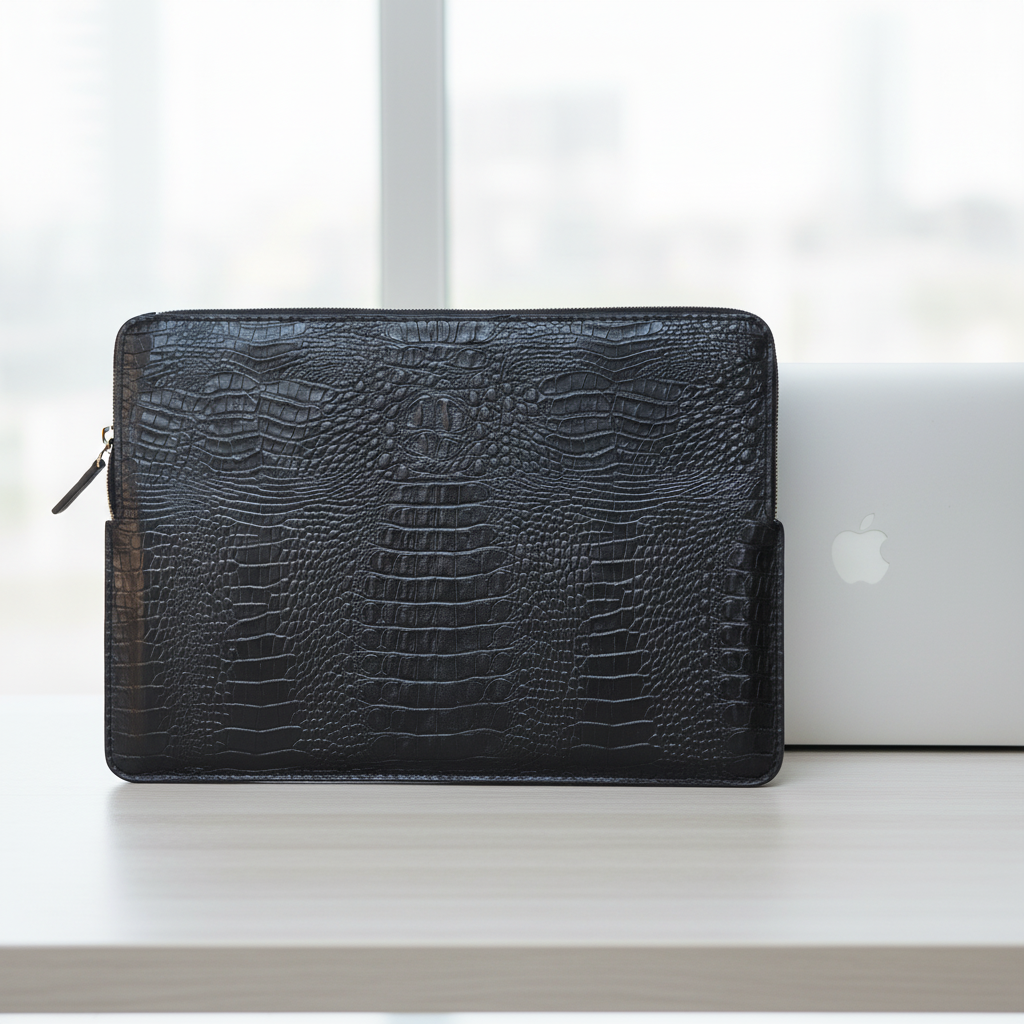 بدنه این کاور از چرم طبیعی گاوی مرغوب با طرح بچه کروکودیل به رنگ مشکی ساخته شده که علاوه بر زیبایی چشم‌نواز، دوام و مقاومت بالایی در برابر سایش، خط‌وخش و ضربه دارد. زیپ فلزی مستحکم به‌ کار رفته در طراحی کاور، امنیت لپ‌تاپ شما را تضمین کرده و حس کیفیت و استحکام را به‌ خوبی منتقل می‌کند.