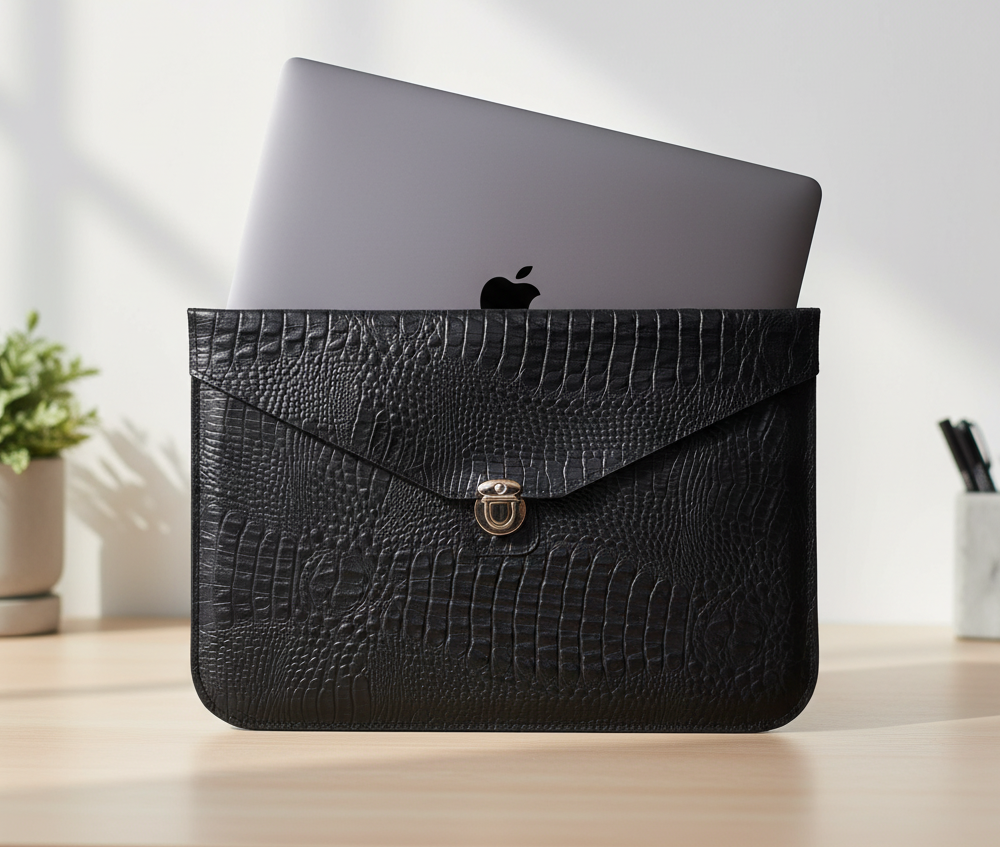 بدنه این کاور از چرم طبیعی گاوی مرغوب با طرح بچه کروکودیل به رنگ مشکی ساخته شده که علاوه بر زیبایی چشم‌نواز، دوام و مقاومت بالایی در برابر سایش، خط‌وخش و ضربه دارد. قفل فلزی مستحکم به‌ کار رفته در طراحی کاور، امنیت لپ‌تاپ شما را تضمین کرده و حس کیفیت و استحکام را به‌ خوبی منتقل می‌کند.