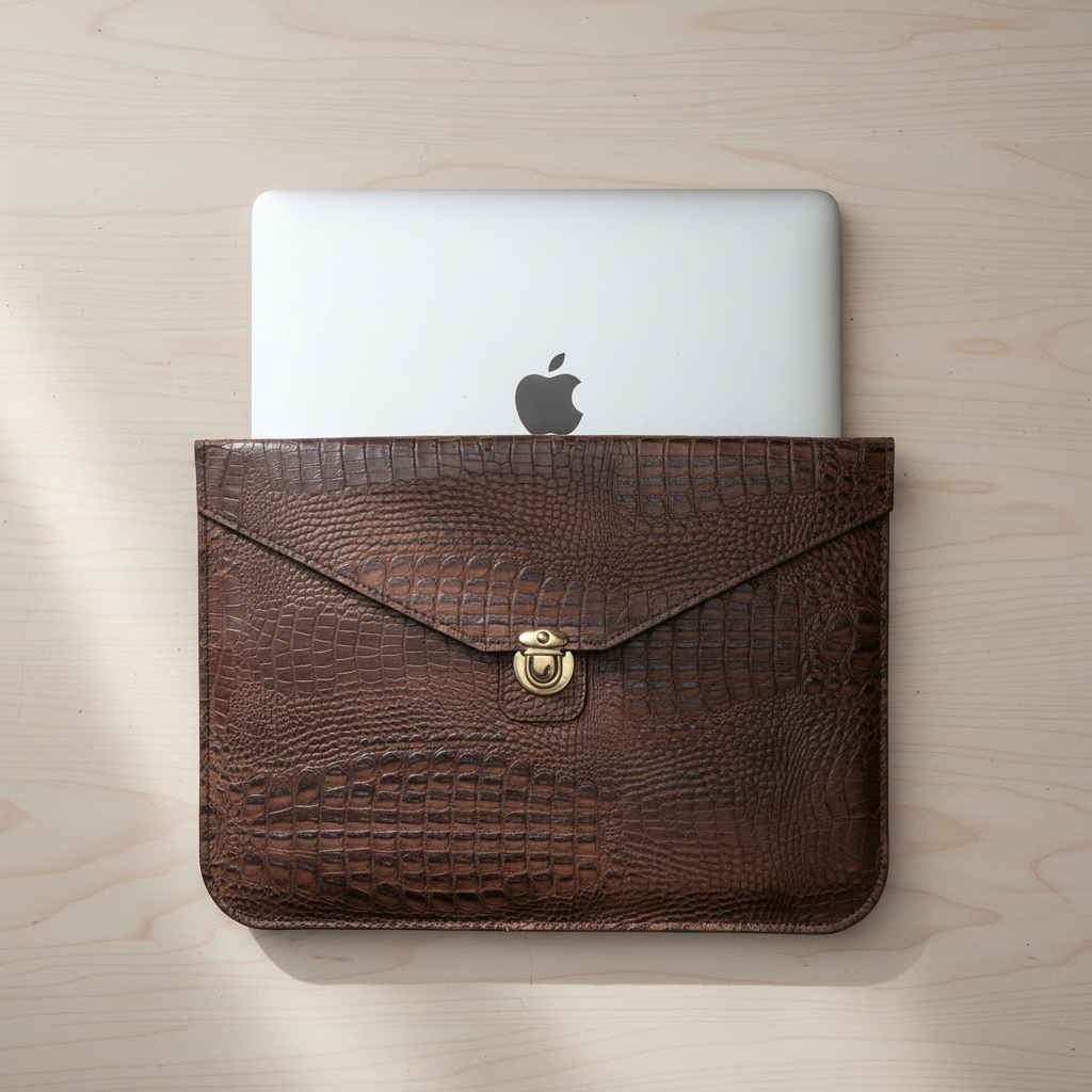 بدنه این کاور از چرم طبیعی گاوی مرغوب با طرح بچه کروکودیل به رنگ نسکافه ای ساخته شده که علاوه بر زیبایی چشم‌نواز، دوام و مقاومت بالایی در برابر سایش، خط‌وخش و ضربه دارد. قفل فلزی مستحکم به‌ کار رفته در طراحی کاور، امنیت لپ‌تاپ شما را تضمین کرده و حس کیفیت و استحکام را به‌ خوبی منتقل می‌کند.