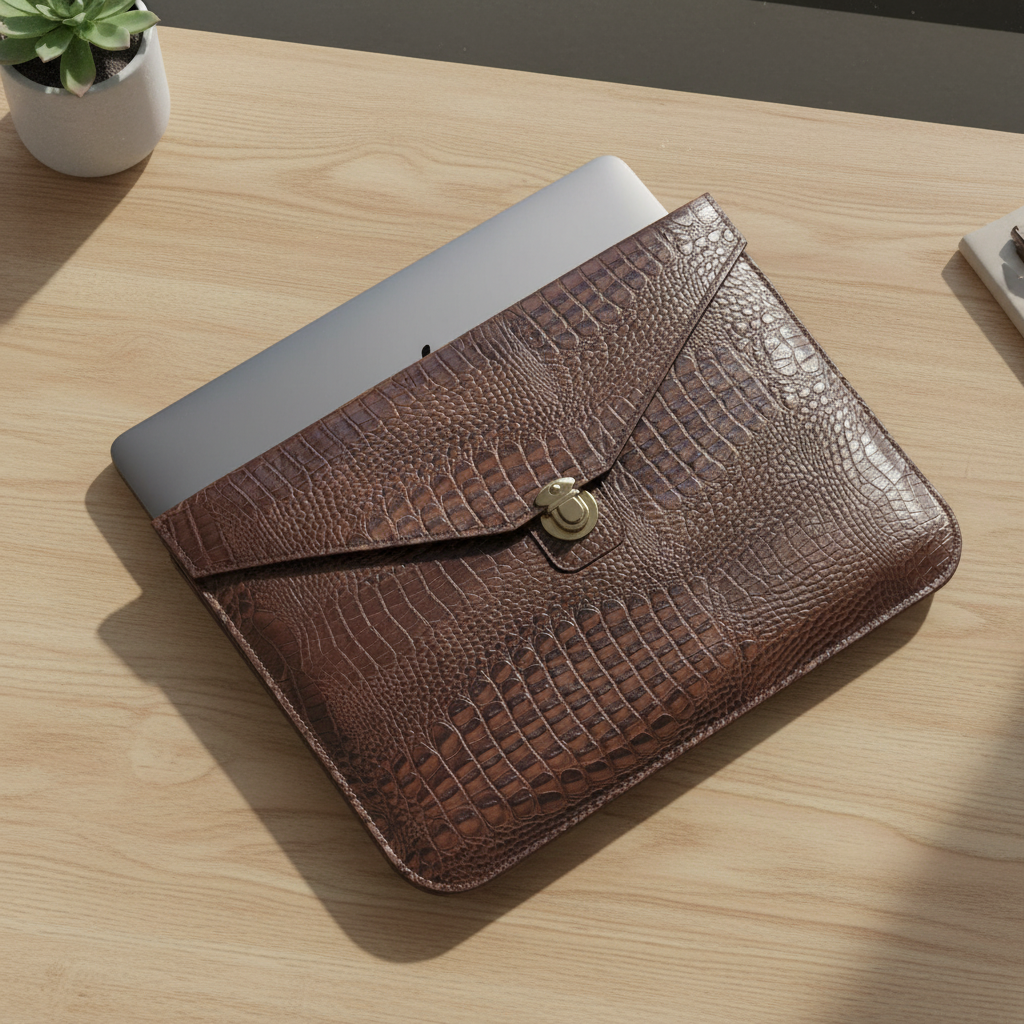 بدنه این کاور از چرم طبیعی گاوی مرغوب با طرح بچه کروکودیل به رنگ نسکافه ای ساخته شده که علاوه بر زیبایی چشم‌نواز، دوام و مقاومت بالایی در برابر سایش، خط‌وخش و ضربه دارد. قفل فلزی مستحکم به‌ کار رفته در طراحی کاور، امنیت لپ‌تاپ شما را تضمین کرده و حس کیفیت و استحکام را به‌ خوبی منتقل می‌کند.