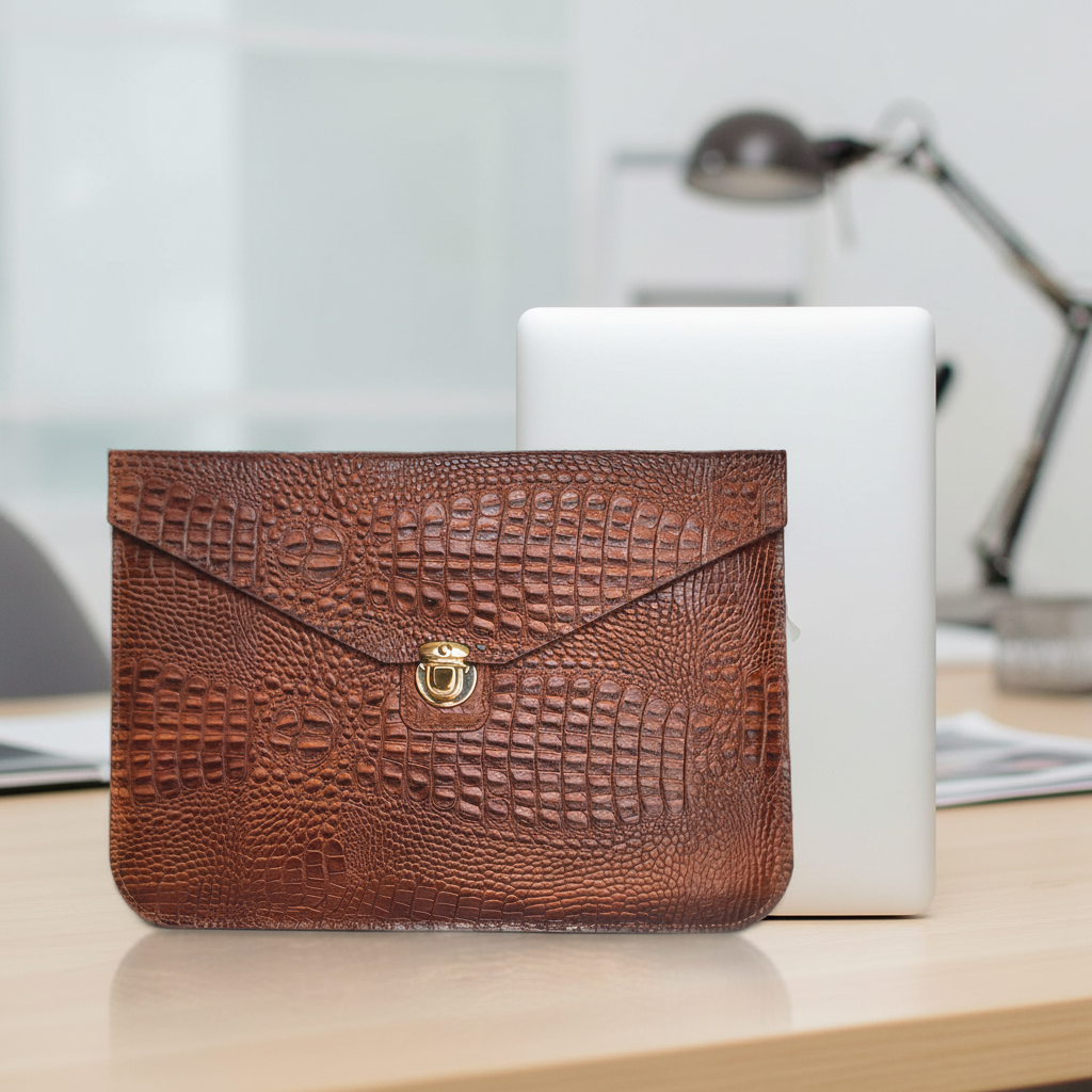 بدنه این کاور از چرم طبیعی گاوی مرغوب با طرح بچه کروکودیل به رنگ عسلی ساخته شده که علاوه بر زیبایی چشم‌نواز، دوام و مقاومت بالایی در برابر سایش، خط‌وخش و ضربه دارد. قفل فلزی مستحکم به‌ کار رفته در طراحی کاور، امنیت لپ‌تاپ شما را تضمین کرده و حس کیفیت و استحکام را به‌ خوبی منتقل می‌کند.