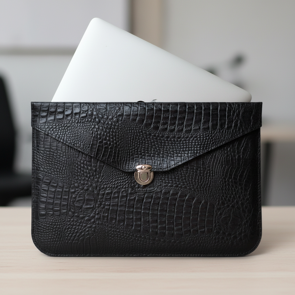 بدنه این کاور از چرم طبیعی گاوی مرغوب با طرح بچه کروکودیل به رنگ مشکی ساخته شده که علاوه بر زیبایی چشمنواز، دوام و مقاومت بالایی در برابر سایش، خطوخش و ضربه دارد. قفل فلزی مستحکم به کار رفته در طراحی کاور، امنیت لپتاپ شما را تضمین کرده و حس کیفیت و استحکام را به خوبی منتقل میکند.
